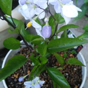 『ヤマホロシ』 見切り品コーナーに風に揺られて 💜🤍𓈒𓏸ゆ〜らゆら𓈒𓏸と私を連れてって的な…🤭💓 とってもお花が可愛くて… 最後の蕾3個が愛おしく思えて… 育てられるか不安でしたが〜連れ帰りました😂 🏷にはヤマホロシ、ナス科とだけでした。 ※皆さんアドバイス宜しくお願い致します(ᴗ̤ .̮ ᴗ̤ꕤ)₎₎
