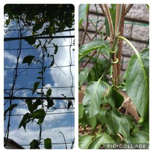 🏷️ニョロンの日 立つか寝転ぶかでやることなくて連続投稿中。スミマセン😅💦💦 4月末に福智山ろく花公園で購入したヤマホロシ(ツルハナナス) 花はとっくに終わりましたが、肥料も無い使用済みの残土なのに、伸びる、伸びる😱💦💦 来春ご期待、枯れなければね😁😁🎶