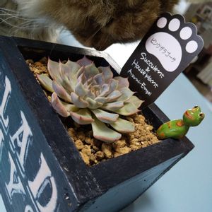 かっきーちゃんのイケメンウッドプランターに、 ピンクザラゴーサを٩( ᐕ)و inꕤ*。゚ チビ🐸「:( ºωº ;):…💦僕今からコイツ🦁に食べられちゃうの?💦」