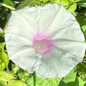 えっ 行灯仕立ての中で、白い朝顔が咲いています🤍 紫のストライブ模様が多い中で、一人ホワイトカラー 4株植えたんですが、この一株は白だけなのかしら⁉️