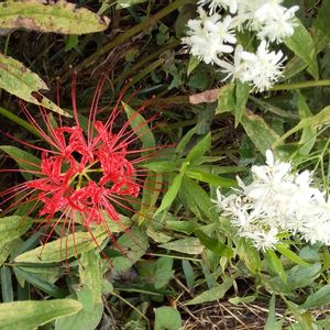 秋の紅白揃い踏み。 ヒガンバナとヒヨドリジョウゴ? ⇒ちゃーちゃんさんから、センニンソウと指摘が有りました。ありがとうございます🙇🏻♀ この景色、見とれちゃいますよね。 (ぼ〜っと見てたので、ヤブ蚊にエサを上げることになりまた)