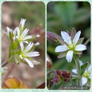 ミミナグサ初めましてです。欧州産オランダミミナグサ(写真右)に圧倒されて今では見つけるのが大変な雑草です。萼片や花茎が赤味を帯びてること、毛が少なめなことが目につきました。決定的な違いは花茎がオランダに比べて長い点だそうです。侘び寂びの雰囲気がさすが在来種❣️5/6静岡県にて、オランダは3月近所にて