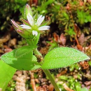ミミナグサ(耳菜草) 薄暗い林の縁、木陰にこの一輪だけ咲いていました。 儚くも可憐な白い花のように見えました✨。 和名は、対生する葉を、ネズミ🐭の耳に見立てて付けられました🐀チュー🎶。 外来種のオランダミミナグサ(阿蘭陀耳菜草)は、日当たりの良い草地や畑地などに生えてます。