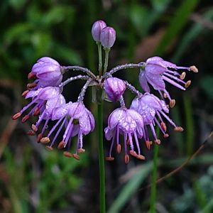 山らっきょう ヤマラッキョウ ヒガンバナ科 ネギ属 分布 福島県以南の本州 四国 急 沖縄 在来種 花期 9〜11月 ・葉 長さ20~50㎝、 幅2~5㎜の円柱状。 ・花 散形花序 茎頂に花柄の長い小さな 花を多数つける。 紅紫色 花被片は6個、 平開しない。 雄しべは6個、花被片か ら長く突き出る。 雌しべ1個、基部に蜜腺 が3個ある。 ・蒴果 3室。 熟すと上部が3裂する。 種子は長さ3~4㎜。 らっきょうに似ているのでラッキョウの名がついたが食用には向かないよう。