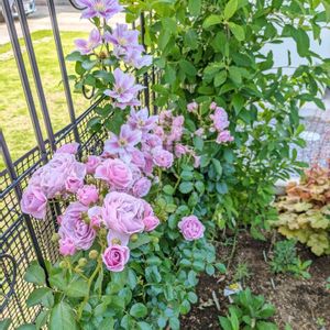 つるバラ羽衣さん&クレマチスピールさん💕 例年クレマチスキリ.テカ.ナワさん が頑張ってくれている場所ですが、 今年はピールさんで、ピンクピンク になってしまいました🤣 キリテカナワさんはお年なのでピールさんが良いよー、私が頑張るから、といってあげているよう🌸 孫娘のピールさんがおじいちゃんのキレテカナワさんを労ってあげているような感じに見えます☺️