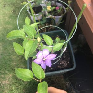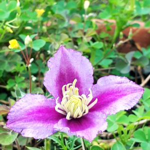 クレマチス ジャックマニー系 🌸ピール🌸 4月に、枯れかけのが安くなってたので、救済! 今年は咲かないと思いましたが 一花だけ、姿を見せてくれました😍 四季咲きだそうなので来年は沢山の花を見せてくれるかな? 下の白い花はニチニチソウのフェアリースター☆*°