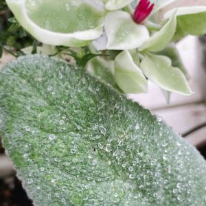今朝のベランダより•*¨*•.¸¸♬︎ 雨上がり、ラムズイヤーの葉の小さな雨粒がお砂糖をまぶしたように見えてちょっと感動( ˘͈ ᵕ ˘͈ )❤︎
