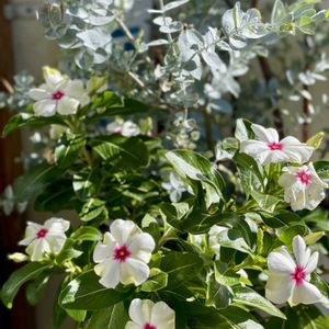 今朝のベランダより・:* .🫧・♡:* .🫧.: 💙 昨日に続き、涼しくなってよく咲いてきた日々草、サマーミントさんです〜 やっぱりこのお子の魅力は、薄らとグリーンが入るところですかねꈍ .̮ ꈍ アイビー雪ホタルもコロコロ丸い葉っぱ🌿がとっても可愛い^^