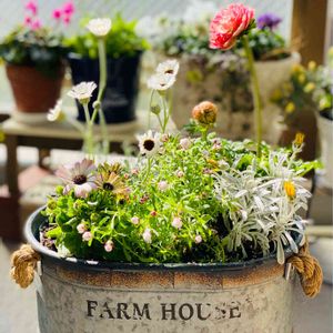カインズでフラワーカート作り ローダンセダムとペチュニアだけ買いラクランジア、オステオスペルマ、スーパーアリッサム、バコパの挿し芽を入れました。 春の寄せ植えが出来ました