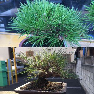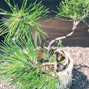 黒松盆栽 樹齢6年🌲 娘の結婚した年に、タネも撒かないのに芽🌱が出た不思議な黒松です🍀 松は縁起が良いのと、ご縁を感じ育てています。 粗々で見た目が悪いですが、針金をかけてみました。 生後6年で、こんな形に成長していました🎶