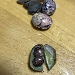 ヤブマメ 今日は天気が良く、畑の草取りに行きました。ヤブマメがキクイモや他の草に絡みつき🌱🌀足を取られました。 兼ねてからの採集をしてみました。 ⤵️ ヤブマメ特徴: 花は筒状で、旗弁が紫色、他の花弁は白っぽいのが特徴です。 また、地上に咲く開放花の他に、花が開かない閉鎖花をつけ、 さらに地下にも閉鎖花をつけて実を結ぶという珍しい生態を持っています。 『地上の開放花、地上の閉鎖花、地下の閉鎖花、という3つのパターンの花をつけて、それぞれの果実はまた違っているらしい。』 との記事を見て。 “地上の開放花”の果実は分かりますが、地下の閉鎖花を初めて掘り起こしてみた。 開放花のマメよりとてつもなく大きな果実が地中からゴロゴロと出て来ました。 ヤブマメの茎を抜くと、豆科なので根粒菌がドッサリくっついて抜けて来ましたが、その下には真っ黒い豆が隠れていました♪ 黒い薄皮を剥いて見ると解放花の果実と同じ色のウズラのたまご色のマメ🫘でした。