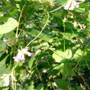 薮豆🌱ヤブマメ 御用水土手🌱🌱🌱 散歩道の柵の向こう‥すご〜く雑草が繁ってます。 白に紫のかわいい花🤍💜 沢山咲いてるけど遠くて‥‥やっと少し近くで👀🤳撮れました👵🤗