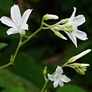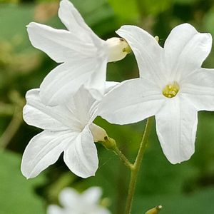 【名前を教えて】 佐賀県の山に向かう途中の田園地帯のガードレールに覆いかかぶさって風に揺れていました。 車道脇の日当たりのいいところに広がっていたので、あんまり希少種感もなく、あとで調べれば、すぐわかるだろうと思っていたのですが、ギブアップです。 蔓性で朝顔のような葉や茎には、朝顔特有の産毛が生えています。 ヒルガオ科だろうと調べるのですが、いくつか撮ったどの写真でも、ヒットするのはジャスミンばかり。 私が知っているジャスミンとは、葉の形も花、葉、茎の質感も全然違います。 自生している園芸種なのかな?園芸種には、全く知識がないんです。 普通の豆朝顔より、少し小さいです。咲き姿も違いますよね。 何でしょう?