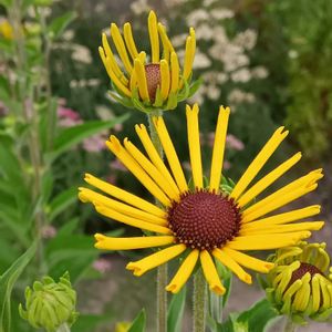 こんにちは♪ ルドベキア・ヘンリーアイラーズ 2年目の花が咲き始めました 今年は株幅もグッと広がり、草丈も150cmほどに! 写真も撮りづらい…😅 ストロー状の花弁がユニークなルドベキアです💛🎶