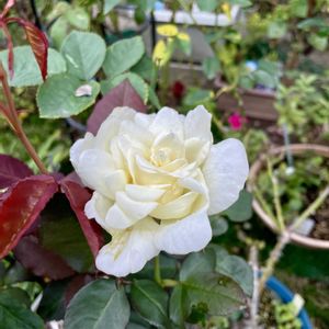 バラ マダムサチ🤍 無事に咲きそうです🌹 🏷️月曜日にはバラを 🏷️毎日ローズショー 🏷️花咲く乙女たち♡ 🏷️ちっちゃいものクラブ エネルギーチャージして きました🍽️🍧😋