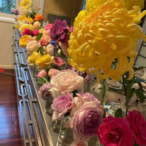 水曜ローズショー に参加させていただきます🌹 雨宿りのバラたち NO1 をやっとテーブルに💕 雨足が強かったのでカットしておいて良かった🤗 マイガーデン