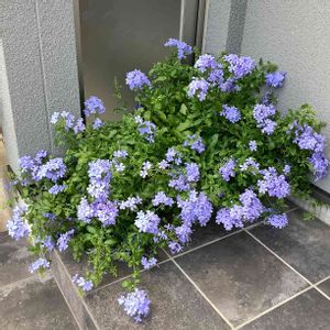 2年目ルリマツリが満開です💙 前回満開が雨でダメになったので玄関軒下に配置していますが、場所を取りすぎるので家族に不評です。ベストポジション捜索中。