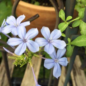 冬には枝だけにぬり、枯れてしまったか、、のように見えたプルンバーゴが今年も元気に咲きました!爽やかなブルーの花、涼しげで大好きな花です❤️