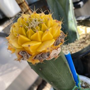 Echinocactus grusonii エキノカクタス 金鯱 夏場に日焼けしちゃった金鯱。 基部が繋がってる双頭苗ですが、両方とも楕円形に間延びして上を向いているので2株植わってる様にしか見えません。 ☆以下駄文☆ 「金の樽サボテン」「金玉(語弊)」「姑用座布団」のニックネームで有名な金鯱(「姑用座布団」とは「お義母さん、お疲れでしょう。まー、座って下さい。コレでもどうぞ」と、言いながら笑顔で渡すのが正解なのでしょうか) 標高1400m程度の火山石斜面に自生している。 世界中で最も普及しているサボテンのひとつだが、現地メキシコでは絶滅危惧種となっている。致命的に減少し始めたのが1990年頃。原産地の一つであるイダルゴのダム建設が大きな要因となった。 この種は大きさ約1m程度まで成長する巨大なサボテンである。そこまで成長するには何年もかかるが、その間に外観も変化していくので、子株と親株とだと見た目が大きく違うのでどっちかしか知らないと「え?これ金鯱?」となるだろう。 花が咲くまでに約20年。世代寿命は約30年(と、いっても年中成長しない日本の環境だともっと長いと思う。てか、この投稿した金鯱サイズから大人の株になるまでどんだけかかるんだろ。先が長そう・・・) 観賞用や、乾燥地の庭用、ロックガーデン用等、広く園芸種として栽培されており、短刺のものや白刺のものもある。 温暖な気候では成長も早く、冬場12℃を下回らない環境が適しているとされている。一時的な寒波が来ても-8℃程度までなら耐えれるであろう。 最後 実際に大人の株が見たければ、多くの植物園で容易に見る事が出来るだろう。 そして、姑の背中をそっと押してあげて下さい。