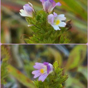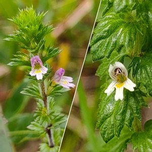 エゾコゴメグサ 🌱ハマウツボ科 コゴメグサ属 ✽白毛が密生する茎は直立して中ほどから対生状に枝を分け、高さが5〜25cmの一年草 ✽密に対生する葉はやや尖る ✽筒状の花冠は2唇形で上唇は2裂し、ときに淡紫色 ✽下唇は3裂する ✽花冠の長さは上唇の先まで約6㎜、内側には紫色の筋と黄色のボカシが入る 場所が変わると花の色が違ってました🤍💜