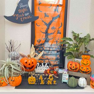 ちょっとGSをお休みしてたら、あっという間にハロウィンウィークに🎃👻 世の中ハロウィンのお祭り騒ぎな雰囲気はちょっと影を潜めてますが😅😅 うちでは今年もほんの少しだけハロウィン気分を…✨✨✨ 玄関先はこんな感じ。 毎年変わり映えしないのですが、今年はカラテア エンペラーさんとエアプランツのキセロさんに友情出演してもらっています😁😁