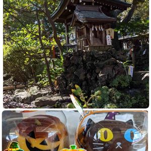 用事が終って 千葉神社に行きました。 美寿の宮のお水を頂きました。井戸水ですが、飲めます。ご利益ありますよーに🙏 今日も1日、良い日でありますよーに。 駅ビルの中にスーパーがオープン🎉のぞいたらハロウィン🎃スイーツ😋 即、買いました😸😅