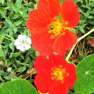7月18日土曜日 ☁️18℃ 今日は、寒い日です。 庭に、咲いていた、ナスタチウムさんです。 白いお✿の名前は、また忘れちゃいました(=^・・^=)🥰 (๑´ლ`๑)フフ♡♥ˎˊ˗ 🎀ᴗ͈ˬᴗ͈)⁾⁾