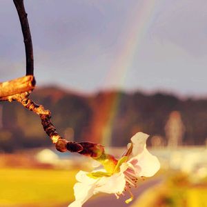 夕方の虹が、桜の横に見えました。 小雨が花にかかって光って素敵な夕暮れでした。 ジーゼル電車に少しずつ紅葉が映えてきました。紅葉見に🍁電車、乗りたいですね。🍂 アッ!もう山は白くなりはじめてしまいました。残念‼️