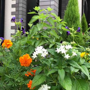 今朝の玄関前から…🧡💛🍀💜🤍🌱✨ ペンタスさんは冬越し❣️ トレニアさん💜は溢れ種から😅 コクネシア❤️が咲いたらもっと賑やかな〜🤔🍀✨✨