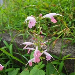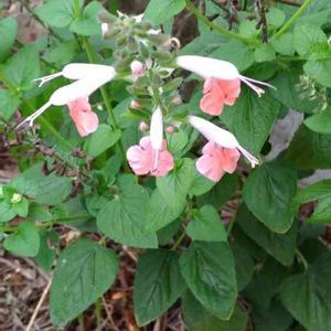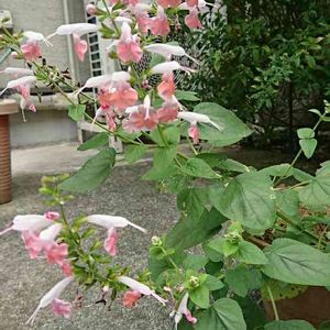 サルビアコクネシア‘18,9,4 8:03 チェリーセージホットリップスの ピンクかと思ったけどピンクは無かった。 別の種類になる。 白色とピンク色が 優しく可愛い💕