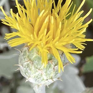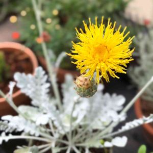 今日は一日雨予報☔️☔️☔️ シルバーリーフ セントーレア マジックシルバーに 黄色いアザミのようなお花が咲きました🌼