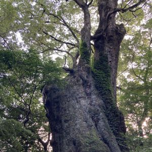 【樹齢3000年の楠木】 境内の急な階段をのぼると、途中にご神木の楠木があります。 『ザーザー サワサワ🎵』 風が枝を揺らし話をしてくれます。それがとても心地よくその場に立ち尽くし耳を澄まします。 風と枝葉のお話しは、私の心も揺らしてくれます。 心地よい午後でした。 『ホームページより』 大楠(樹齢三千年以上)は、境内参道西側(南大門の西)にそびえ、樹高三十m・根回りは三十四m・地上二mの幹回りは十九mもあり、幹の下部は空洞になっており大人が十数人も入る事が出来る。 我が国でも有数の巨木であり、大正十一年三月に国の指定を受ける。 平成元年、環境庁巨木調査にて全国大七位。