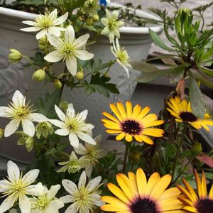 2年目のクレマチスピクシー 爽やかなモスグリーンの小さいお花が沢山ついて可愛い💕 去年は大きな鉢へ植え替えたので、支柱を立ててぐるぐる仕立てようかと思ってます😆 少し花数は減ったけど、今年もオステオステルマムが咲き始めました🌼 お庭が華やかで楽しい