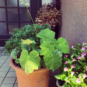 ケーキ屋さんの庭に素敵な寄せ植えがありました。