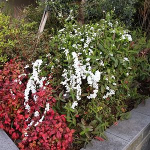 🏷️今日のお花 数日前の雪柳、まだ咲き始めです 隣の赤いブッシュにしなだれている様子が、ステキです✨