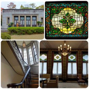 旧渋沢庭園内 「青淵文庫」 ステンドグラス 渋沢家の家紋 「丸に違い柏」にちなんで柏の葉がデザインされている。 「青淵文庫」内、2階書庫に続く階段。