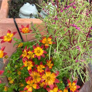 こんにちは 昨日作った寄せ植えです🪴 お花屋さんで見本で展示してあった二種類をそのまま植えました お玄関脇の階段のローズマリーの鉢にちょこんとぶら下がり😊 居候に居候してます💦 皆さまのpicでコキアの紅葉が素晴らしかったので一株チョイス これから赤くなるかは不明ですけど‥ 紅葉の呪文を教えて下さい🪄🧙♀️ コキア ビデンス?タグ捨てちゃいました😎