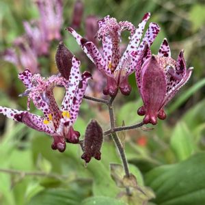 💜タイワンホトトギス ホトトギスより花弁が細めでシャープで全体的に斑点が濃く多いのが特徴です。園芸で良く流通しています。 ⚫︎ユリ科 ホトトギス属 ⚫︎原産 台湾 ⚫︎花期 9月〜10月