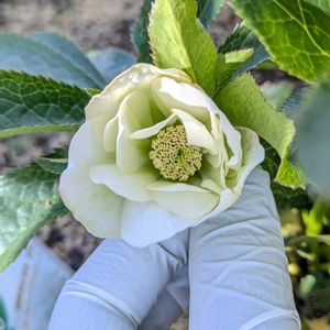 クリスマスローズのセルフィーを🤳 (うつむいて咲くので、インカメ設定のiPhoneを差し込んでなんとか撮れました)