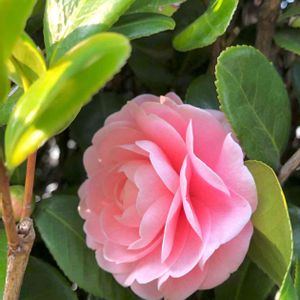 《椿・ダローネガ》 実家の庭に、淡黄色の花色を持つ椿、ダローネガが咲きました😊🌿。流通が比較的少なく、珍しい淡黄色の椿です😃‼️。 中輪で花弁が大変多い千重咲きで、とても人気があります。 「ダローネガ」という名前は、その淡黄色の花のイメージから、全米で一番最初にゴールドラッシュが起きた町の名前に由来し、とても縁起の良い名前です😊✨。 *新元号発表の時にと、本日upしました😃🌟。
