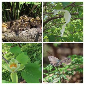 ハンカチの木とユリノキを目の高さで見たくて花友達に相談して見られそうなところを聴きました あとはアッシー君がどこに連れて行ってくれるか? 今回は智光山公園へ 同じ場所の投稿2枚目になります ハンカチの木は矢印が門の所にあったのですぐに見つかり 確かに目の前でお花が見れました ユリノキは花の数が少ないけれど開花途中の花が1つ 目の前で見れました 池ではカルガモの雛がお休み中 ヒメウラナミジャノメは光輝いて綺麗でした ゴールデンウィークは天気が良くて良かったですね