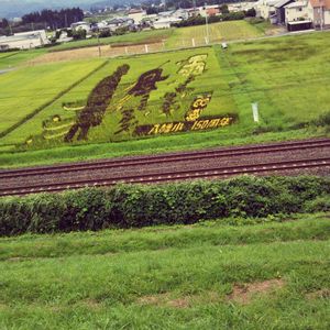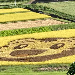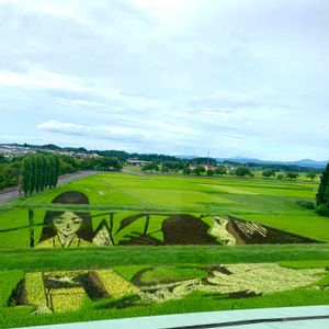 車窓により ちょっと分かりにくいですが 小学生 地区民による田んぼアートです✨ 何か わかりますか?😅