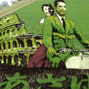 昨日、台風が来る前に見ておこうと、 奥州市アテルイの里の田んぼアートを見に行きました。 10周年だそうで、大歌舞伎の「祝勢揃壽連獅子」(せいぞろいことぶきれんじし)を表現しているとのこと。