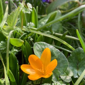 多層プランティングの植栽にクロッカスが咲き始めました。後ろ側にはヒヤシンソイデス・ヒスパニカ(シラーカンパニュラータ)、オルレアやアネモネなどが次の出番を待っています。