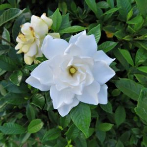 バラのように綺麗に咲いた「クチナシ(八重)」に出会えました。 パチリ 夏に栄養を蓄えたためか、夏前の花より、綺麗なような。🤔