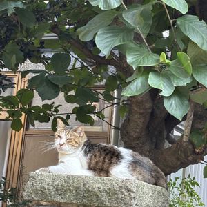 通勤路で出会うコの、朝の定位置。 涼しくて見晴らしが良い、モクレンの下。 塀の元はゴミ集積所。 ゴミ捨てに来る住民や、通勤中の行き交う人を、のんびり眺めています😅🐈