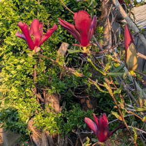 紅色の「シモクレン(紫木蓮)」のお花をパチリ!📸💜🌿😊😄🌞✌️ 今日もととのいました。♨️🧖♂️🍺👌