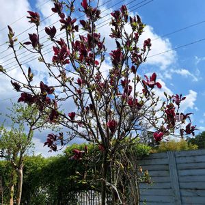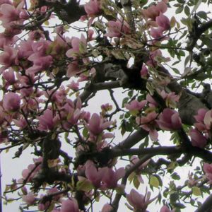 おはようございます☺️PEKO地方曇り空☁️モクレン花咲き出しましたよ♥️💜樹齢50年位の木 本当だったら♥️💜お花がいっぱい咲くはずなのにチラホラ💦今年も奴らに🐧🐦🦅食われました😱