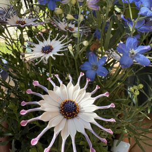 昨年秋に挿し芽で1本だけ成功した 【オステオスペルマム・サニーフィリップス】 寒い時期に挿し芽しましたが、1本だけ成功してくれました😌 3月にアネモネと寄せ植え(写真2枚目) アネモネの花が終わった頃、入れ替わるように咲き始めてくれました😊 アネモネがたくさん咲いてる写真も撮っておけばよかった😓 【ブラキカム】も3月は花少なめでしたが、今はサニーフィリップスを引き立てくれるように沢山咲いてくれてます。