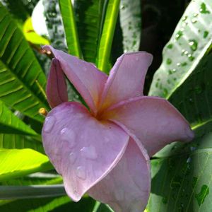 プルメリア「パープルジャック」 雨上がりのプルメリア🌼 少し花の色も変化して…… 後蕾が一つだけ💞